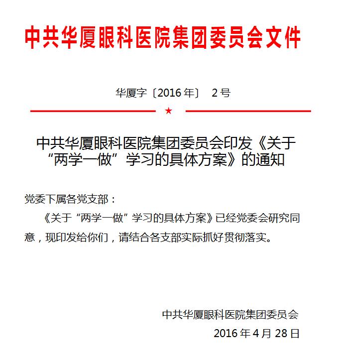 【文章導(dǎo)讀】中共華廈眼科醫(yī)院集團(tuán)委員會關(guān)于兩學(xué)一做學(xué)習(xí)的具體方案 為推進(jìn)全面從嚴(yán)治黨,根據(jù)黨中央《關(guān)于在全體黨員中開展學(xué)黨章黨規(guī)、學(xué)系列講話,做合格黨員學(xué)習(xí)教育方案》和思明區(qū)組