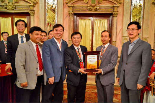 在中國(guó)駐尼泊爾大使吳春太先生(右一)舉行的答謝宴會(huì)上,尼泊爾阿尼哥協(xié)會(huì)主席Sarbottam Shrestha (右二) 向姚曉明博士頒發(fā)感謝狀。
