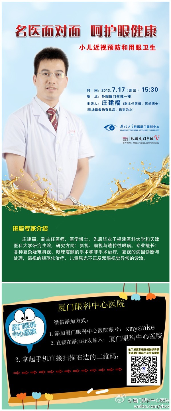 【文章導(dǎo)讀】2013年7月17日15:30分,廈門眼科中心小兒眼科莊建福博士將在外圖廈門書城一樓免費(fèi)為青少年講述如何預(yù)防近視?,F(xiàn)場(chǎng)將還有免費(fèi)禮品贈(zèng)送。