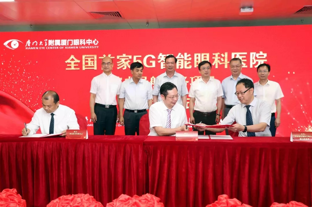 ▲廈門大學(xué)附屬廈門眼科中心董事長蘇慶燦與華為移動網(wǎng)絡(luò)數(shù)字化集成與運營總經(jīng)理段學(xué)鵬、中國電信廈門分公司總經(jīng)理黎樹旺正式簽約“5G智能眼科醫(yī)院”