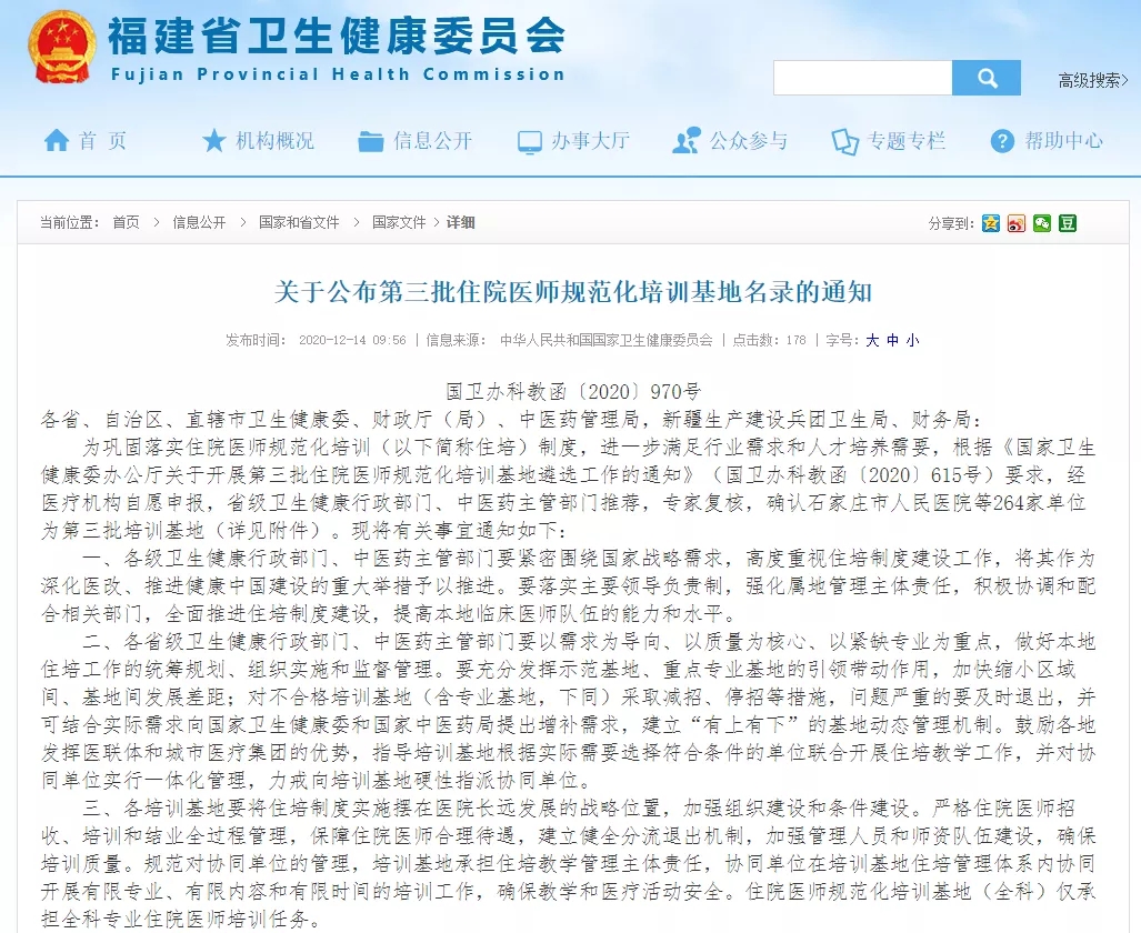 【文章導(dǎo)讀】近日,根據(jù)國家衛(wèi)生健康委員會(huì)辦公廳、財(cái)政部辦公廳、國家中醫(yī)藥管理局辦公室聯(lián)合發(fā)布的《關(guān)于公布第三批住院醫(yī)師規(guī)范化培訓(xùn)基地名錄的通知》(國衛(wèi)辦科教函[2020]970號(hào))文件,