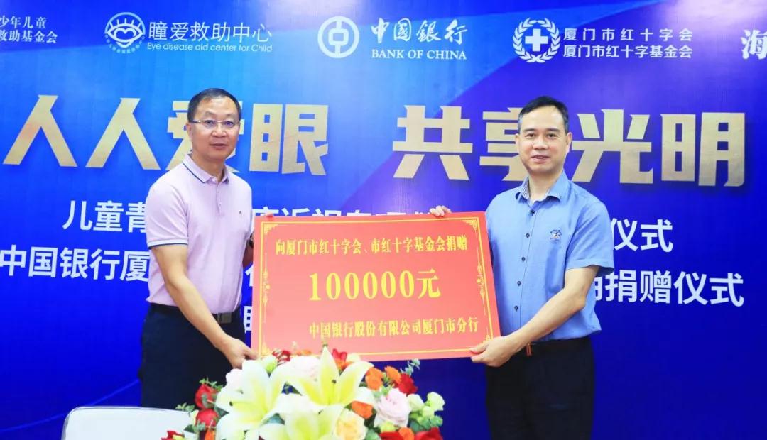 活動當天,還舉辦了中國銀行股份有限公司廈門市分行、廈門市紅十字會光明捐贈儀式。中國銀行廈門分行積極擔當社會責任、履行社會義務,在愛眼日來臨之際,向廈門市紅十字基金會捐贈10萬元,用于困難眼疾患者的救助。