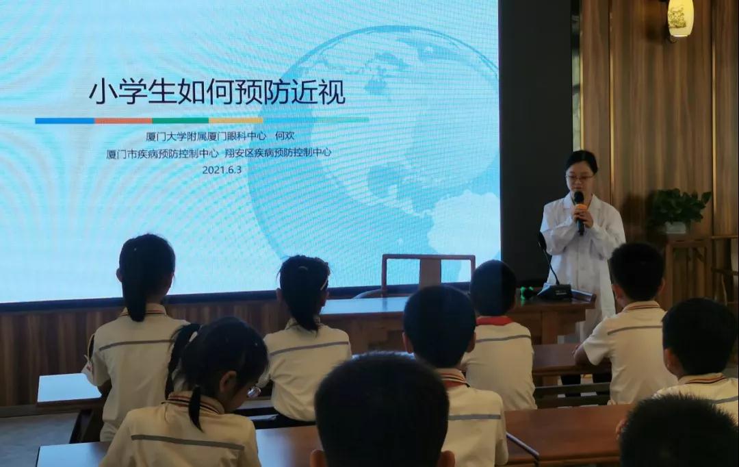 ▲廈門眼科中心斜視與小兒眼科副主任醫(yī)師何歡為小學生進行近視防控科普