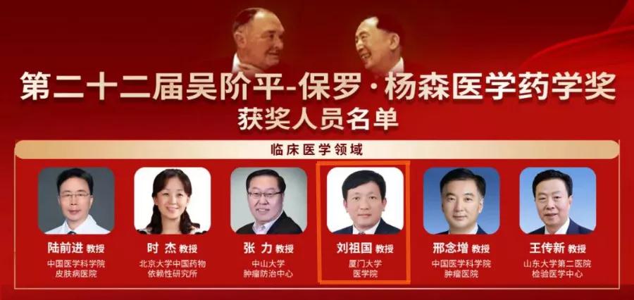 截至2021年,先后有449位優(yōu)秀醫(yī)藥衛(wèi)生工作者榮獲該項(xiàng)殊榮,其中共有38名院士。此次吳楊獎(jiǎng)全國(guó)共有15人獲此殊榮,我院劉祖國(guó)教授為其中之一。