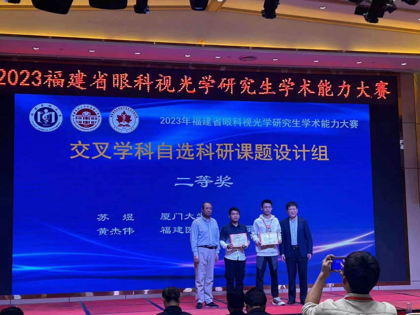廈門眼科中心斜視與小兒眼病中心修陽暉博士指導(dǎo)的2023級專業(yè)型碩士研究生蘇煜代表廈門大學(xué)參賽,以嚴(yán)謹(jǐn)?shù)目蒲兴悸放c臨床思維,展現(xiàn)出良好的精神風(fēng)貌和綜合素質(zhì),獲得在場的專家評委一致好評,最終以總分全省第二的好成績斬獲“交叉學(xué)科自選課題組二等獎”。