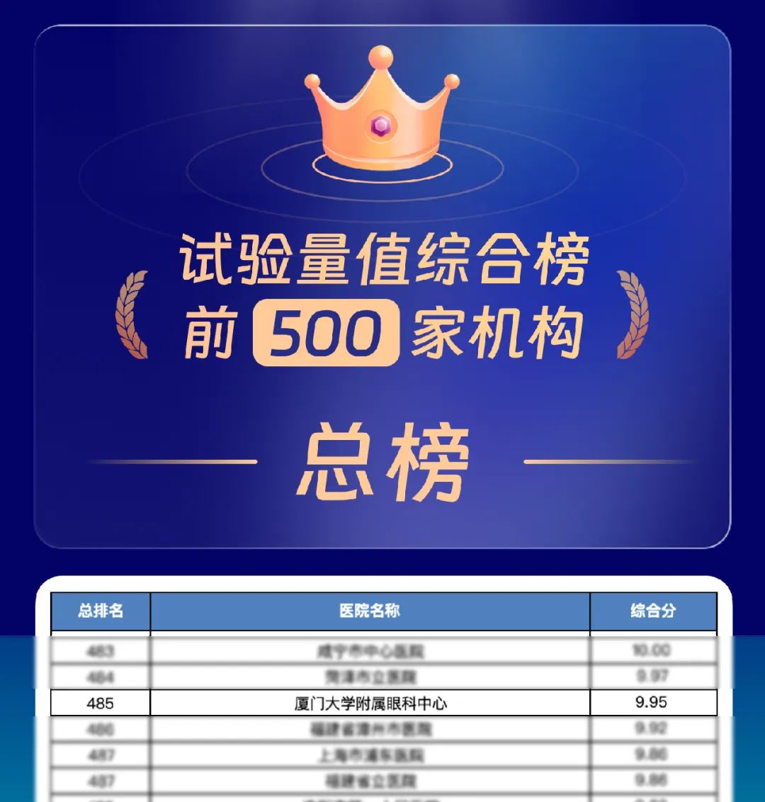 近日,新一年度的《全國(guó)GCP機(jī)構(gòu)藥物臨床試驗(yàn)量值排行榜》正式發(fā)布,廈門(mén)眼科中心再次入列全國(guó)排行榜單!