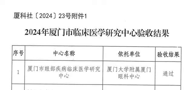 閃耀香江,放眼未來【文章導(dǎo)讀】日前,廈門市科學(xué)技術(shù)局對(duì)廈門市5家疾病臨床醫(yī)學(xué)研究中心開展了驗(yàn)收,經(jīng)過層層嚴(yán)格評(píng)選、現(xiàn)場答辯和實(shí)地考察后,我院建設(shè)的眼部疾病臨床醫(yī)學(xué)研究中心成功通過驗(yàn)收! 廈門市眼